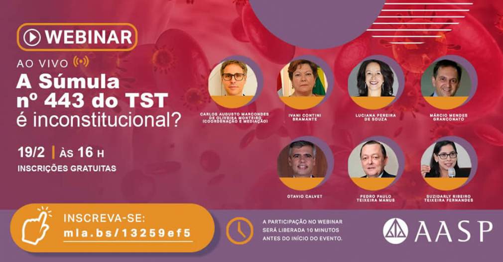 A Associação dos Advogados de São Paulo (AASP) promove na sexta-feira, dia 19, às 16h, o webinar gratuito “A Súmula nº 443 do TST é inconstitucional?”.