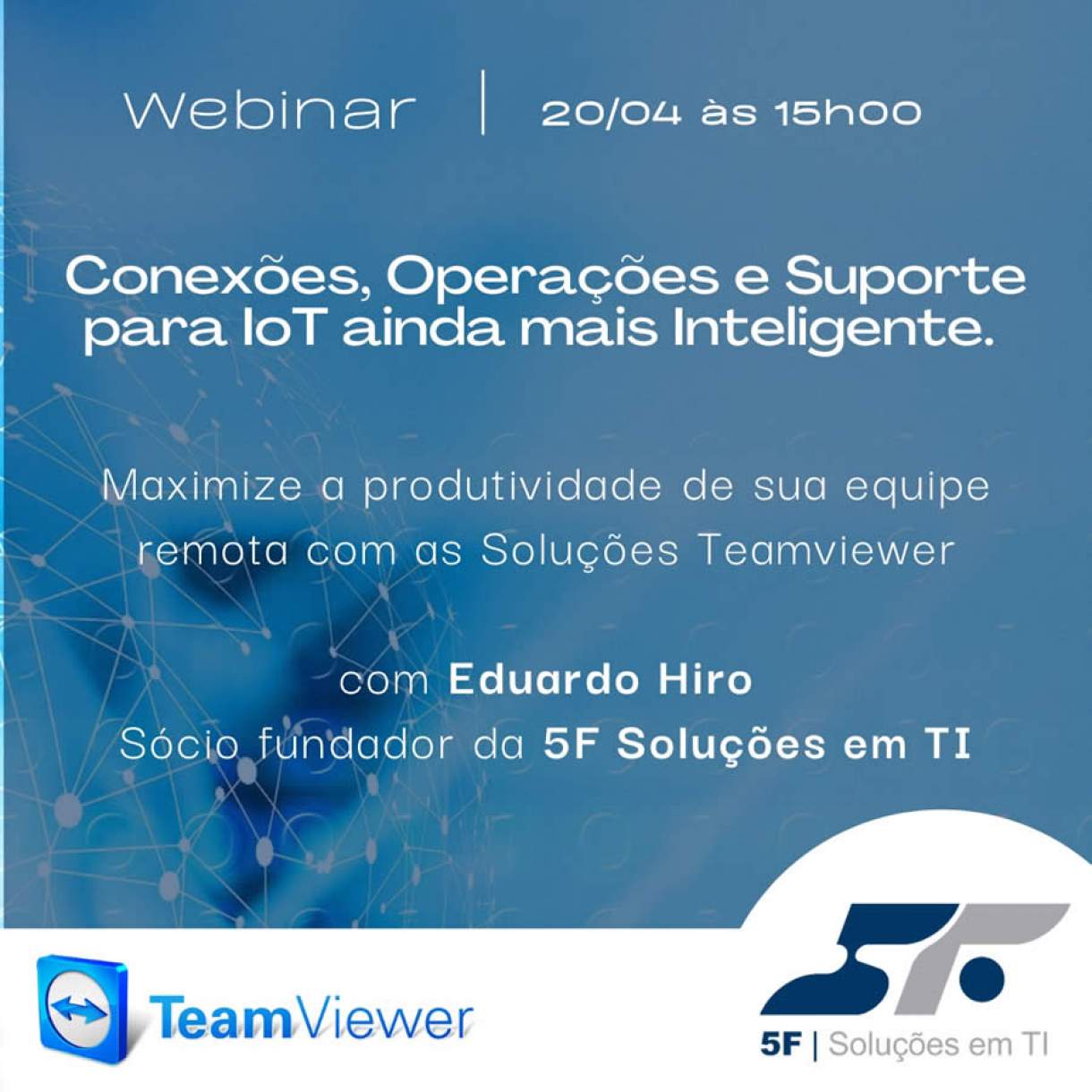 O webinar acontecerá às 15 horas do dia 20 de abril com apresentação de Eduardo Hiro Inoue, parceiro TeamViewer, sócio-fundador da 5F Soluções em TI e experiente profissional especialista em tecnologia com histórico comprovado em projetos e serviços de valor agregado e consultoria para clientes empresariais e governo. Com duração de uma hora, Hiro mostrará aos participantes como controlar, gerenciar e reparar computadores, dispositivos móveis e máquinas em rede, a qualquer hora e de qualquer lugar, por meio das soluções inteligentes TeamViewer, incluindo para IoT.