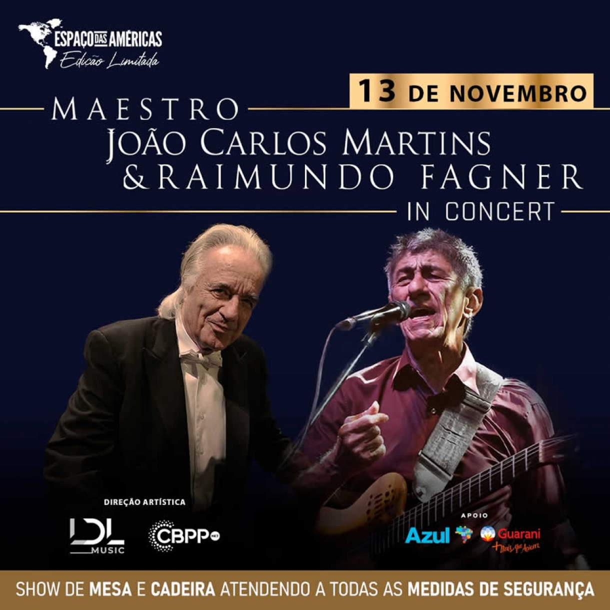 As empresas LDL Music e CBPP Marketing, idealizadoras e responsáveis pela direção artística do projeto João Carlos Martins In Concert, realizarão, no Espaço das Américas, dia 13 de novembro, o espetáculo "João Carlos Martins e Raimundo Fagner In Concert ". Os ingressos para esta única experiência já estão disponíveis.