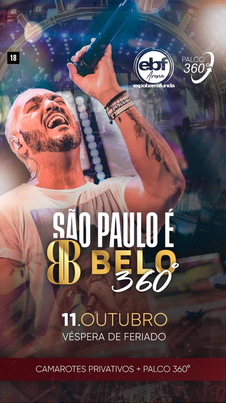 Com o público rodeando o palco montado no Expo Barra Funda, o cantor das multidões apresenta o show 360 e traz novidades no repertório. Além dos sucessos já consagrados do grupo Soweto, onde Belo ganhou destaque, e músicas do seu repertório solo, ele apresentará ao público versões de grandes hits do pagode como Inaraí e Lua Vai, do grupo Katinguelê, Pela Vida Inteira do Kiloucura, Brilho de Cristal do Pixote, além de uma sequência de Só Pra Contrariar e Raça Negra, e claro, sua nova música de trabalho – “Sonho Por Sonho”, lançada no dia 01 de outubro.