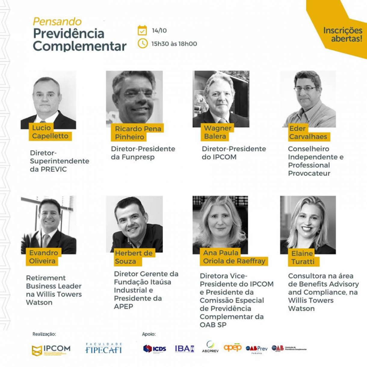 Serão expositores: Lucio Capelletto, Diretor-Superintendente da PREVIC; Ricardo Pena Pinheiro, Diretor-Presidente da Funpresp; Wagner Balera, Diretor-Presidente do IPCOM; Eder Carvalhaes, Conselheiro Independente e Professional Provocateur; Evandro Oliveira, Retirement Business Leader na Willis Towers Watson; Herbert de Souza, Diretor Gerente da Fundação Itaúsa Industrial e Presidente da APEP; Ana Paula Oriola de Raeffray, Diretora Vice-Presidente do IPCOM e Presidente da Comissão Especial de Previdência Complementar da OABSP; e Elaine Turatti, Consultora na área de Benefits Advisory and Compliance da Willis Towers Watson.