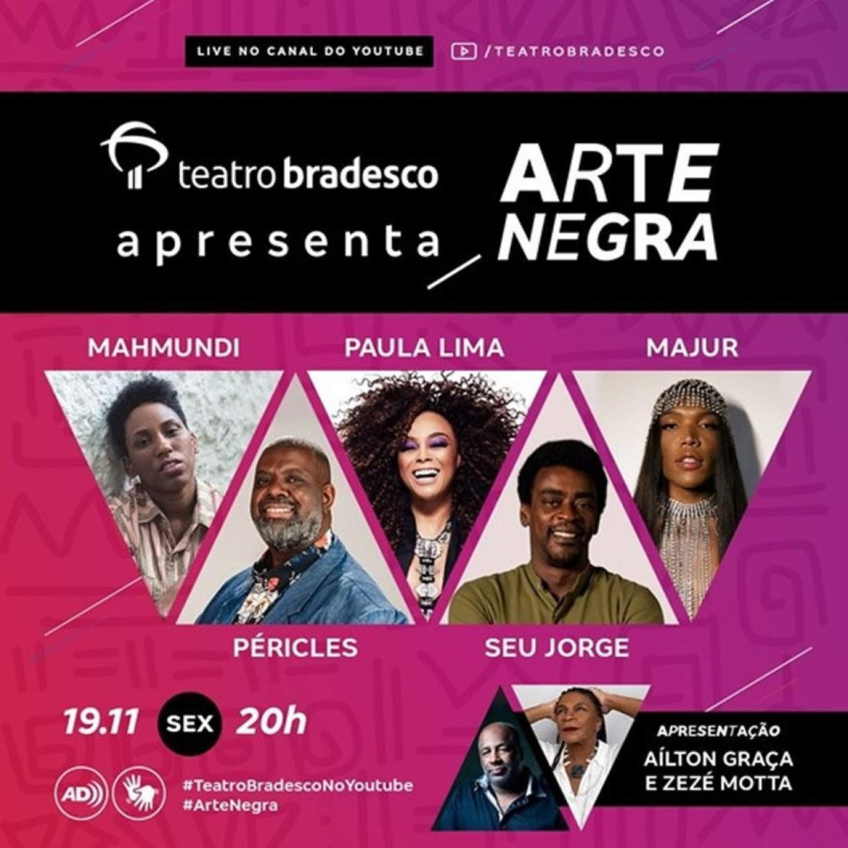 A live "Arte Negra" será transmitida ao vivo gratuitamente e com exclusividade, a partir das 20h, no canal do Teatro Bradesco no YouTube.