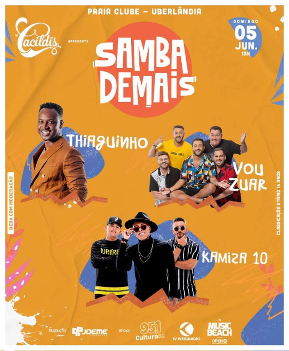 Com muita animação e batucada boa, o Samba Demais se prepara para desembarcar em Uberlândia, Minas Gerais, no próximo domingo, dia 05 de junho. Nesta edição, o projeto vai levar ao palco Thiaguinho, Vou Zuar e o grupo Kamisa 10. Iniciativa da Som Livre, o evento acontecerá no Praia Clube, no mesmo dia da final do campeonato de Beach Tennis, e terá abertura dos portões às 13h. Os ingressos estão disponíveis na bilheteria do clube e no site Ingresso Live.