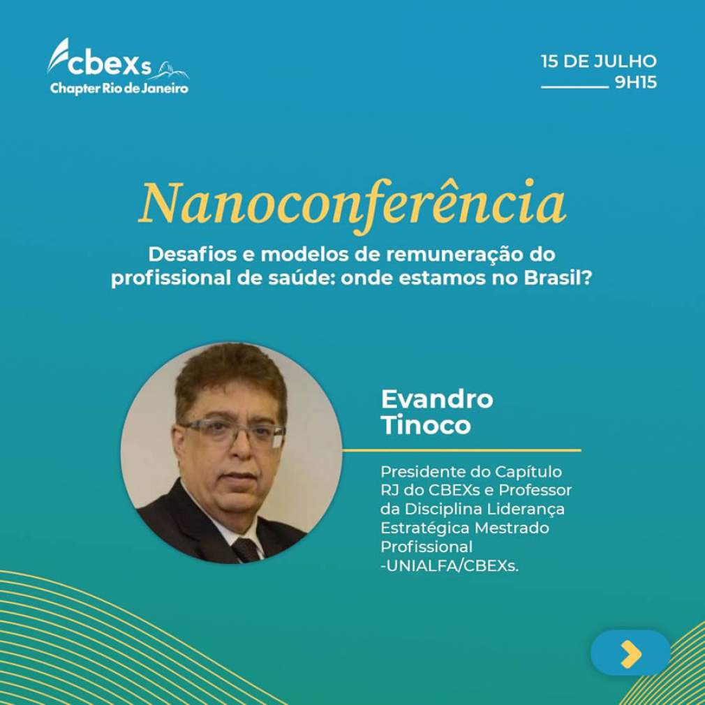 Serão apresentadas duas Nanoconferências, uma com o tema "VBHC - Academia e Mercado: Visões complementares" - Apresentação de Artigo / Survey na América Latina sobre Saúde Baseada em Valor, com o palestrante Dr. Thiago Constancio - VP Chapter Rio CBEXs e CEO do Medportal; e outra sobre "Desafios e Modelos de Remuneração do Profissional de Saúde - Onde estamos no Brasil?", com o palestrante Dr. Evandro Tinoco - Presidente do Chapter Rio do CBEXs e Liderança Estratégica - MPA UNIALFA/CBEXs.