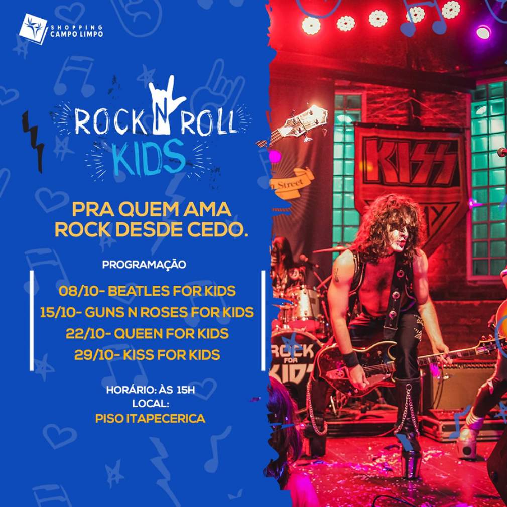 Para celebrar o mês das crianças, o Shopping Campo Limpo promove nos dias 8, 15, 22 e 29 de outubro, o festival Rock Kids. As apresentações gratuitas visam estimular seus visitantes mirins a terem contato com os clássicos do rock´n´roll.