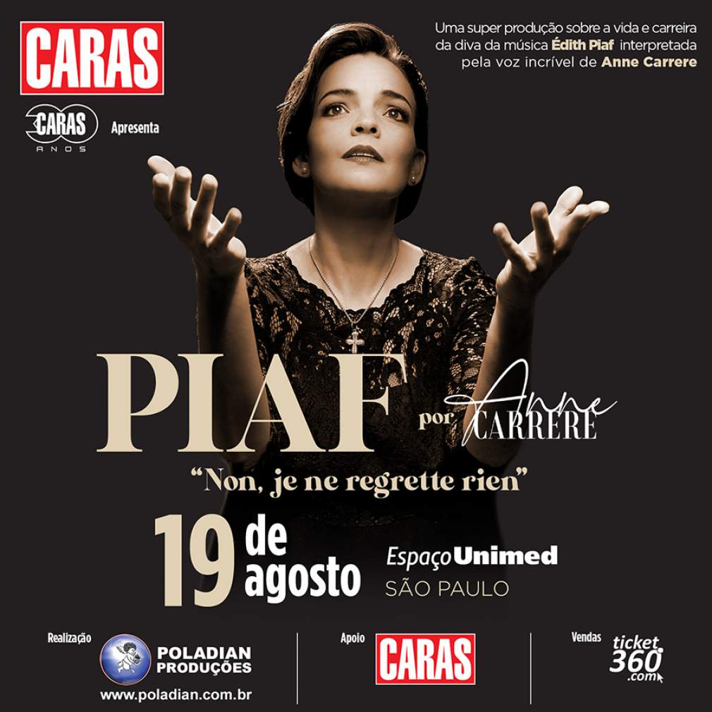 Em agosto, Anne Carrere volta ao Brasil com o show “Piaf! Non, je ne regrette rien”. Maior intérprete de Piaf, a cantora francesa se apresentará em Belo Horizonte (MG), no dia 18 de agosto, no Palácio das Artes; São Paulo (SP), em 19 de agosto, no Espaço Unimed; Curitiba (PR), em 20 de agosto, no Teatro Positivo; Porto Alegre (RS), em 25 de agosto no Auditório Araújo Vianna; e no Rio de Janeiro, em 26 e 27 de agosto, no Theatro Municipal do Rio de Janeiro.