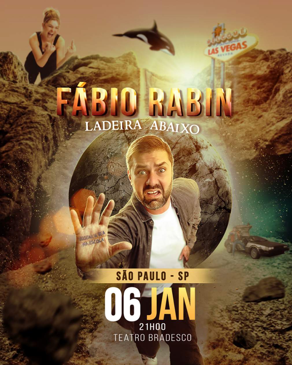 O show também fala sobre os 40 anos na vida de um homem, onde alguns gostos mudam, prioridades novas aparecem, além de dores, pelos, rugas, unhas podres, flatulências. Tudo isso é esmiuçado pelo olhar clínico de um comediante que prefere levar a vida, em todas as fases, de forma mais leve, sendo otimista e positivo. Inclusive, Rabin, o que você pode nos falar sobre isso: “Daí pra frente é só Ladeira Abaixo…”