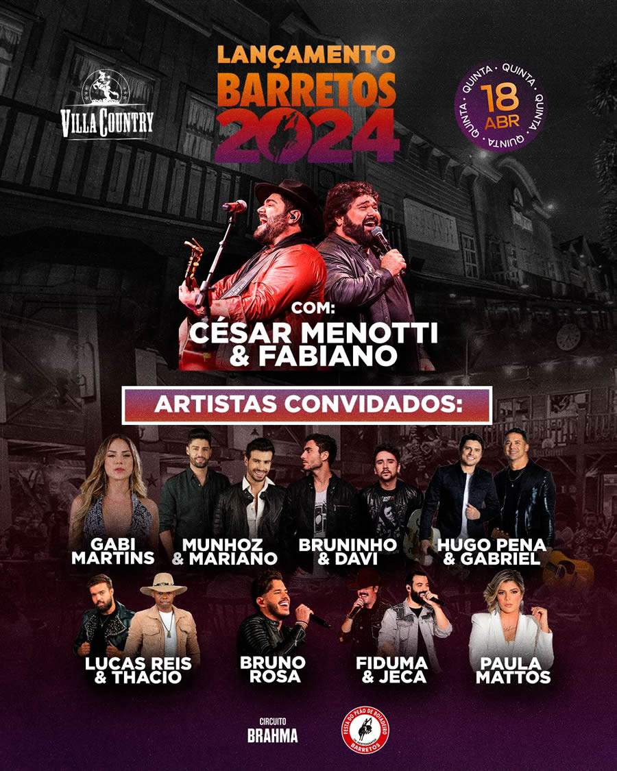 Ingressos: Disponíveis nas bilheterias do Villa Country de quinta a domingo, das 20h às 23h, nas bilheterias do Espaço Unimed, de segunda a sábado, das 10h às 19h (exceto feriados) ou através do site da Ticket 360 (https://www.ticket360.com.br/evento/28574/ingressos-para-lancamento-barretos-2024-com-cesar-menotti-e-fabiano)