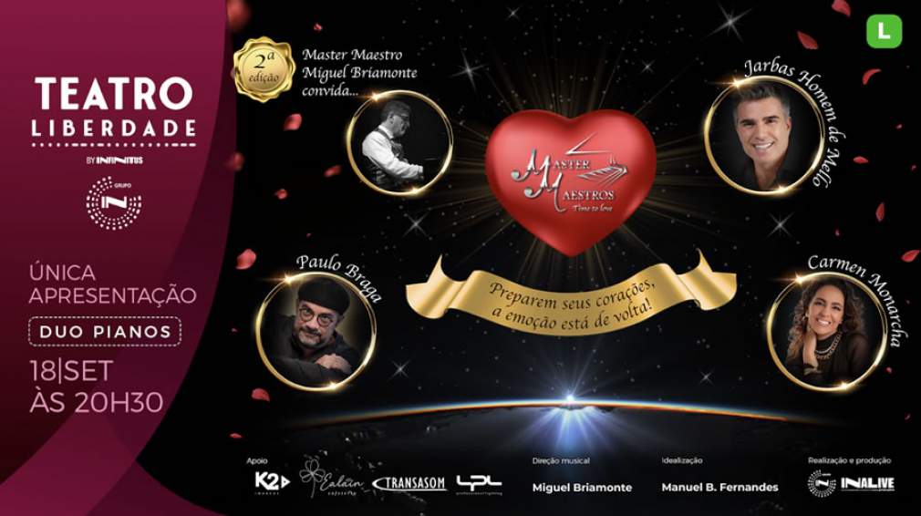 Está chegando a hora de se deixar envolver novamente pela magia dos pianos. Idealizado por Manuel Fernandes e sob direção musical do maestro Miguel Briamonte, “Master Maestros II – Time To Love” chega ao Teatro Liberdade dia 18 de setembro, quarta-feira, 20h30.