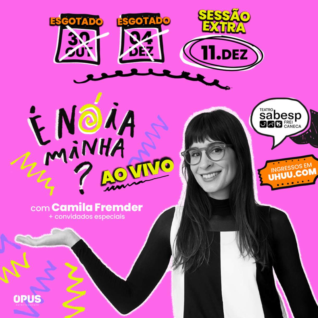 Que Camila Fremder é um sucesso em tudo o que faz, isso não é segredo para ninguém. Em 2019, a escritora e roteirista resolveu resgatar a essência das crônicas que escrevia no começo de sua trajetória e transformou o material em um podcast. Assim, nasceu o “É Nóia Minha?”, que já conta com mais de 300 episódios, mais de 31 milhões de plays e cerca de 1 milhão de ouvintes mensais, em seus quase 5 anos no ar. Agora, o público poderá assistir a episódios ao vivo, no palco do Teatro Sabesp Frei Caneca, em São Paulo.
