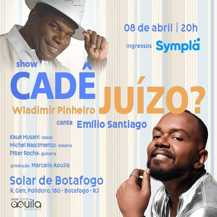 O inesquecível cantor Emílio Santiago ganha um espetáculo em sua homenagem. O show “Cadê Juízo” fará um passeio pela sua trajetória por meio de canções que se tornaram emblemáticas pela sua voz, como “Saigon”, “Lesões Corporais”, “Verdade Chinesa”, “Perfume Siamês” e... “Cadê Juízo?”. A estreia será no dia 08 de abril, terça-feira, às 20h, no Teatro Solar de Botafogo, na Zona Sul carioca.