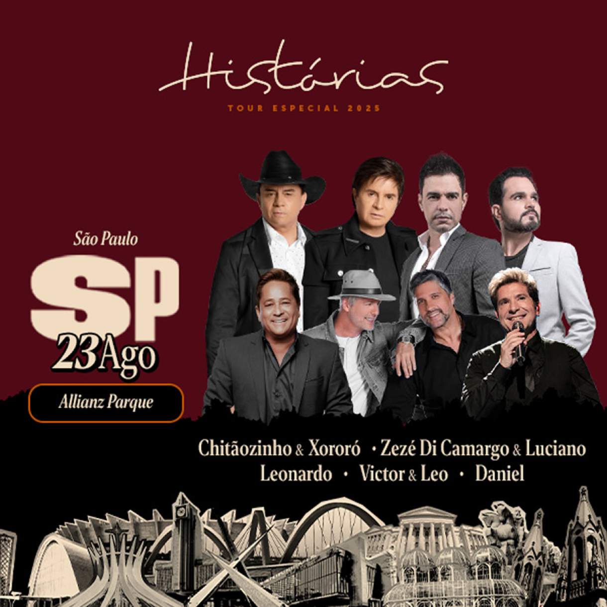 Imagina reunir no mesmo palco os maiores ídolos do sertanejo e todo legado de repertórios e trajetórias incomparáveis. É histórico e com certeza “O show do século” que chega a São Paulo neste fim de semana, no dia 23 de agosto (sábado), em mais uma edição do festival “Histórias”. O palco do Allianz Parque receberá um time de artistas que fizeram e continuam fazendo história: Chitãozinho & Xororó, Zezé Di Camargo & Luciano, Leonardo, Daniel e Victor & Leo.