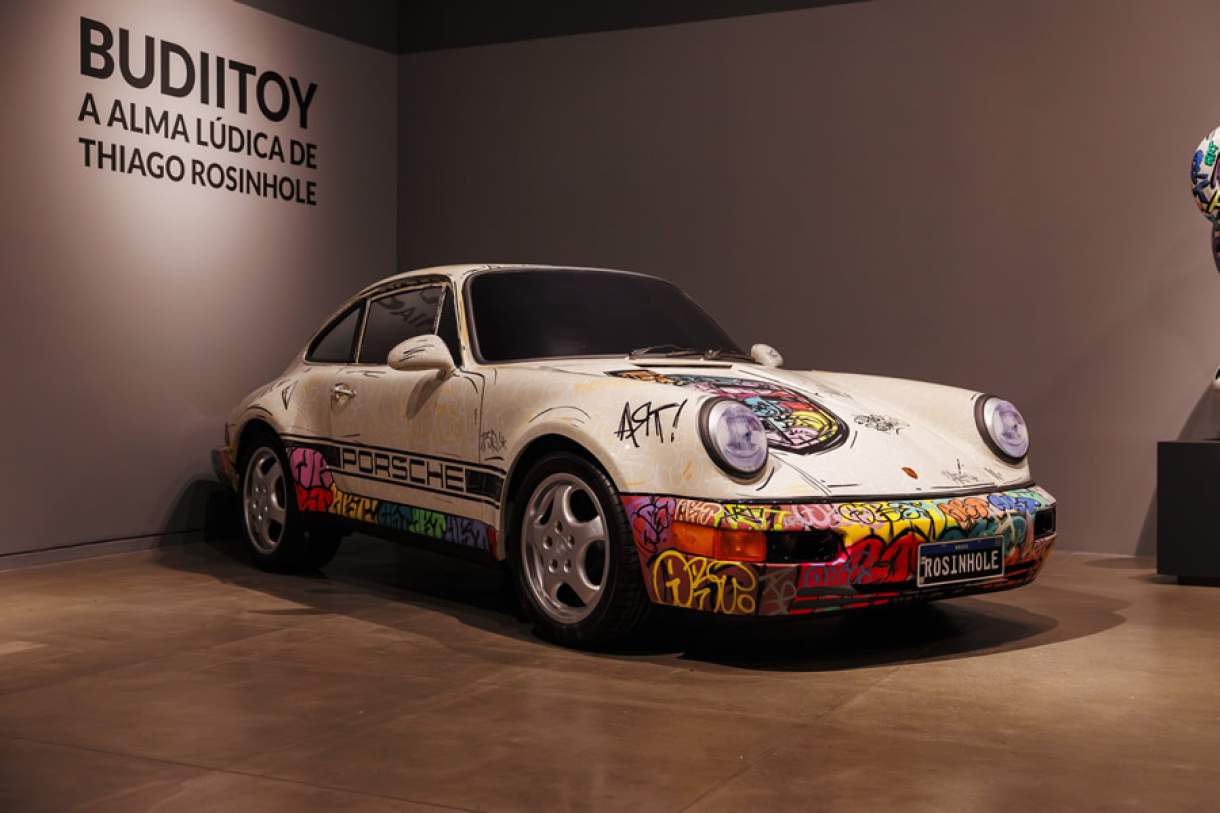 Na exposição, o público encontra um recorte amplo da produção do artista em diferentes formatos e suportes, que ajudam a reconstruir tanto a trajetória de Budii quanto a evolução do próprio Thiago. Entre os destaques da mostra estão dois automóveis transformados em obras de arte. Um deles é uma Porsche criada em fibra de vidro, peça autoral que recria uma Porsche 964 Carrera S de 1994. Atualmente exibida com a carroceria totalmente personalizada, a obra propõe um diálogo direto entre arte, design e engenharia e segue em desenvolvimento. O projeto prevê que o veículo receba motor e componentes mecânicos em 2026, ampliando sua dimensão conceitual e funcional.