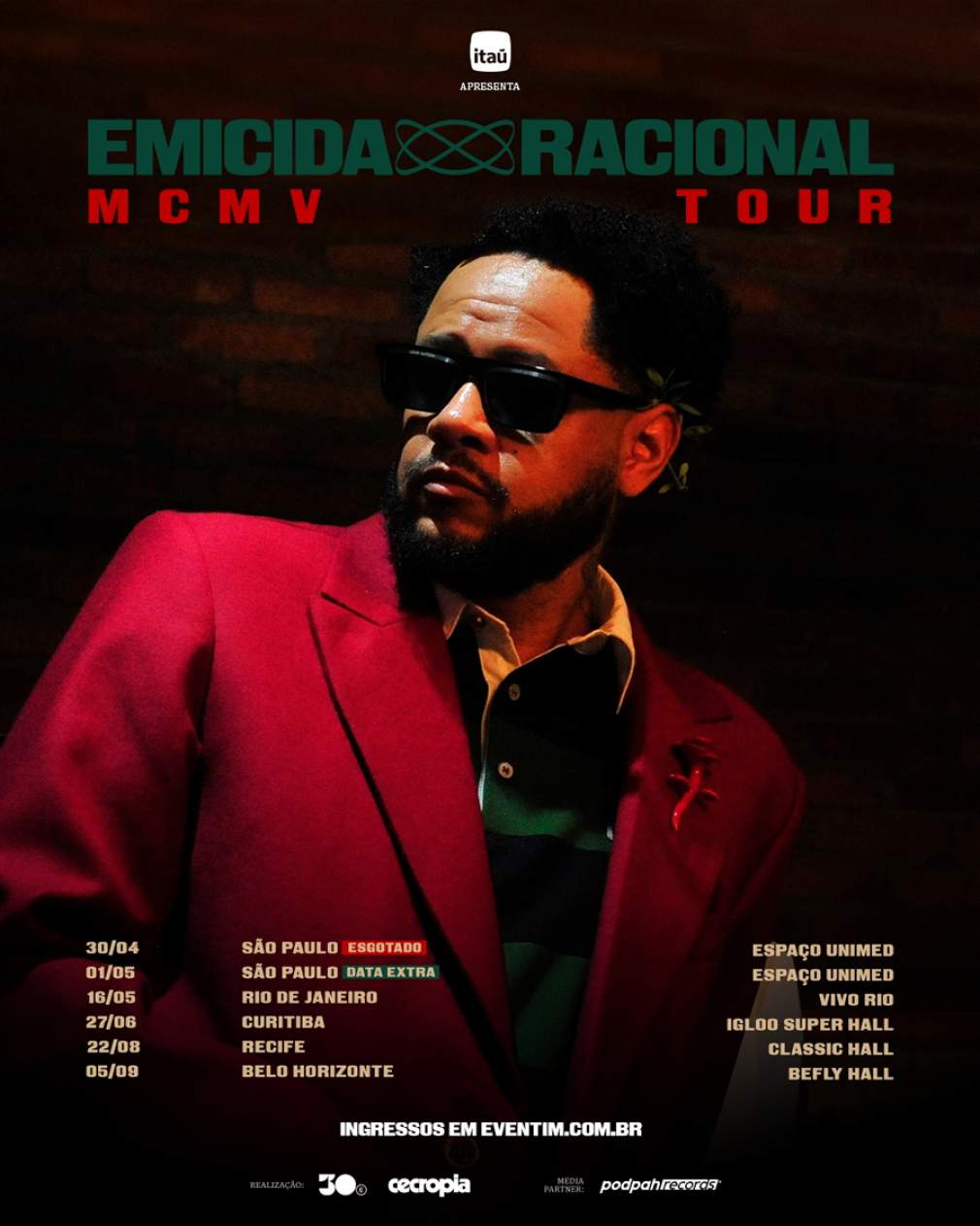 A forte conexão entre Emicida e o público de São Paulo ganha um novo capítulo: uma data extra da Emicida Racional MCMV Tour na cidade. A venda de ingressos para o novo show, marcado para 1º de maio, no Espaço Unimed, começa nesta quinta-feira, 12 de março, ao meio-dia, pelo site da Eventim (acesse aqui). Realizada pela 30e, maior companhia brasileira de entretenimento ao vivo, apresentada pelo Itaú Live e concebida pela Cecropia, a turnê também passa por: Rio de Janeiro, em 16 de maio, no Vivo Rio; Curitiba, em 27 de junho, no Igloo; Recife, em 22 de agosto, no Classic Hall; e Belo Horizonte, em 5 de setembro, no BeFly Hall.