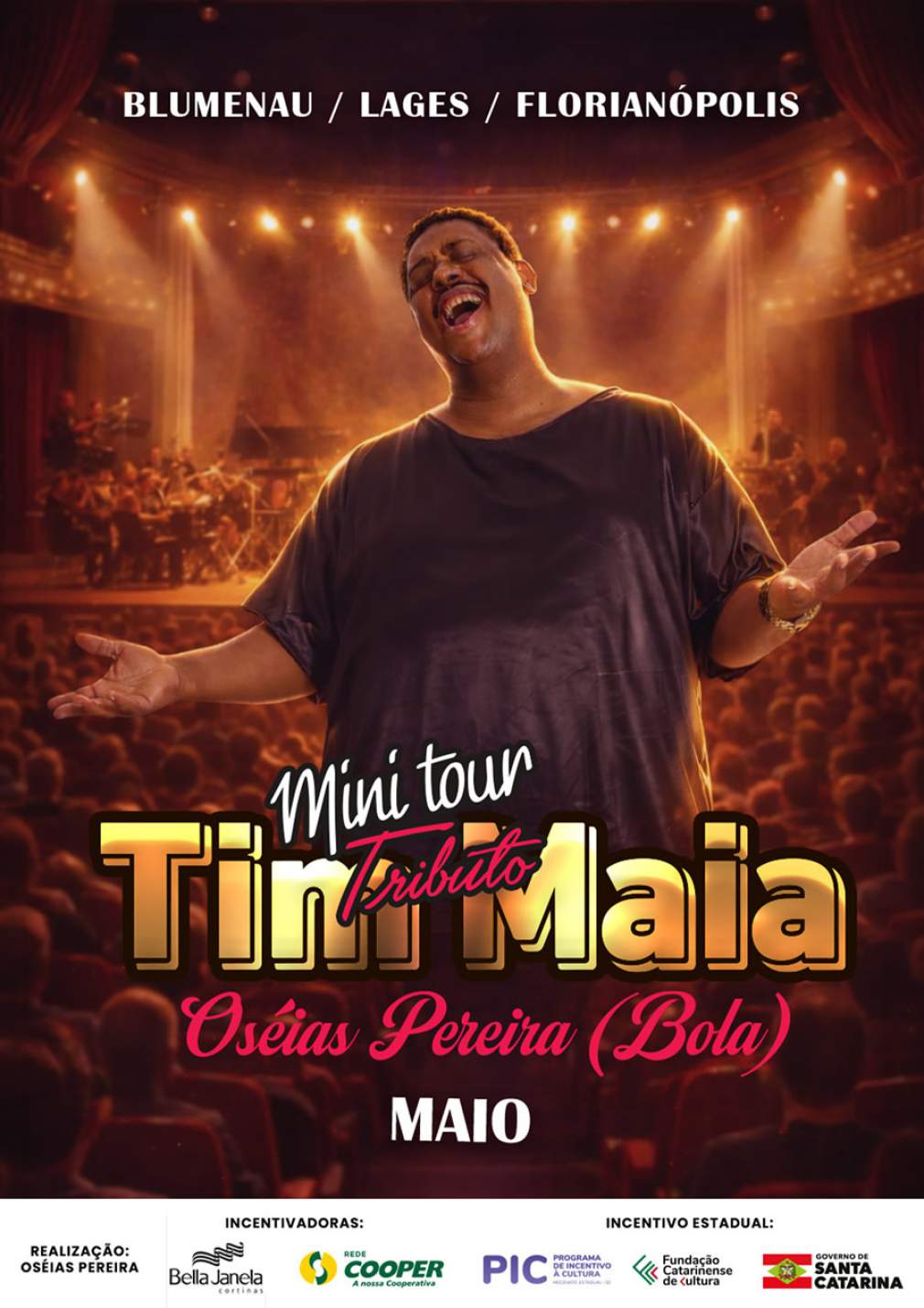Música Popular Brasileira em destaque. Em maio, Blumenau, Lages e Florianópolis recebem os shows do projeto Mini Tour - Tributo ao Tim Maia, com o artista Oséias Pereira (o Bola) e banda. No dia 7 de maio, a apresentação ocorre no Auditório Heinz Geyer, do Teatro Carlos Gomes, em Blumenau; no dia 14 de maio, no Teatro Marajoara, em Lages; e no dia 21 de maio, no Teatro Pedro Ivo Campos, em Florianópolis; todas respectivamente às 20h. A homenagem é ao cantor e compositor carioca Tim Maia (1942-1998), reconhecido como um dos maiores músicos da MPB e pioneiro na introdução do soul e funk na música popular brasileira. O repertório do show de Oséias Pereira e banda conta com interpretações de canções como: O Descobridor dos Sete Mares, Sossego, Gostava Tanto de Você, Primavera, entre outras. As apresentações são gratuitas, contam com tradução em LIBRAS, acessibilidade arquitetônica e os ingressos antecipados estão disponíveis pelo Sympla.