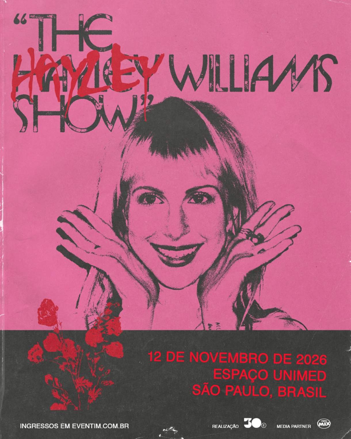 “The Hayley Williams Show” está chegando ao Brasil. Em uma realização da 30e, maior companhia brasileira de entretenimento ao vivo, a turnê desembarca em São Paulo no dia 12 de novembro, no Espaço Unimed. A pré-venda para fãs terá início no dia 4 de maio, às 10h, com duração de 24 horas. A venda geral começa no dia 6 de maio, às 10h, pela Eventim (acesse aqui). O cadastro verificado para a pré-venda pelo HW HQ começa hoje 27 de abril, às 10h, e também dura 48 horas (acesse o link).
