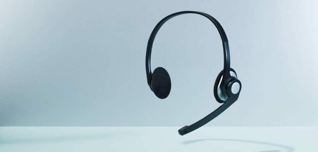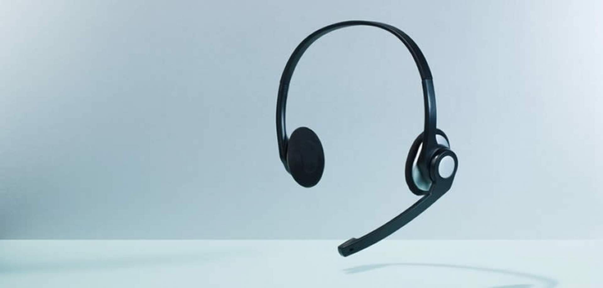 Um headphone é exibido flutuando em frente ao fundo com degradê azul claro