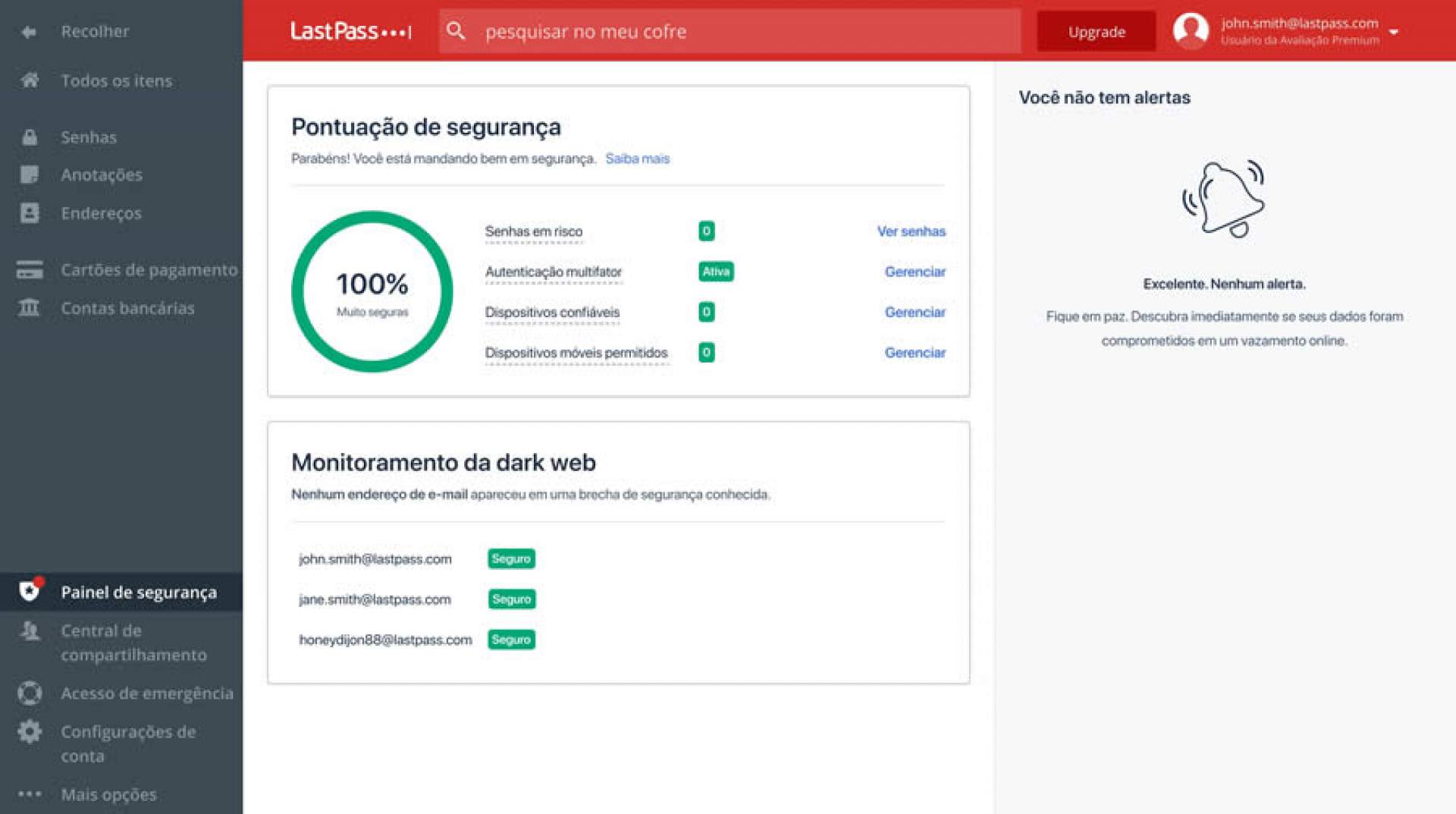 O novo painel de segurança será implementado para todos os usuários atuais do LastPass. Os clientes LastPass Premium, Famílias e Empresarial também podem ativar o monitoramento da dark web no Painel de Segurança.