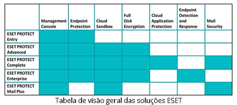 Para garantir que empresas de todos os portes estejam equipadas com as soluções certas, a ESET oferece uma seleção de pacotes adaptados às necessidades comerciais específicas de escritórios domésticos, pequenas e médias empresas (SMBs), grandes corporações (Enterprise) e provedores de serviços gerenciados (MSP). Para ver o conjunto completo de soluções ESET, consulte a seguinte tabela: