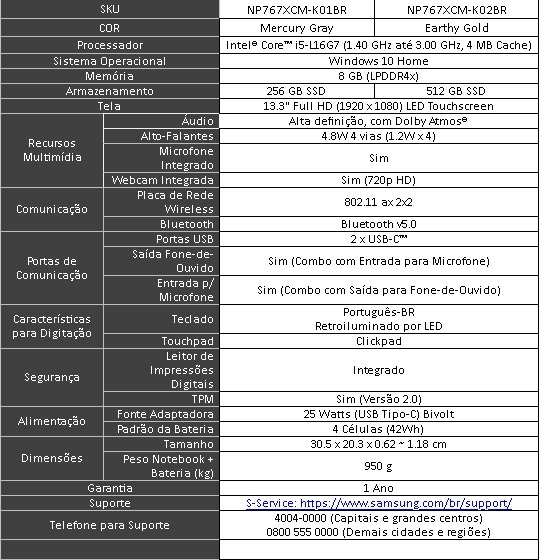 O Galaxy Book S chega com as principais características da família de produtos da companhia, elevando a conectividade ao Ecossistema Galaxy, como smartphones e TVs. Seguindo a premissa de oferecer dispositivos que atendem às mais variadas necessidades dos cotidianos, o Galaxy Book S é o notebook mais fino já lançado pela Samsung, com apenas 1,18 cm de espessura, e um dos mais leves do mercado, pesando somente 950g. Tudo isso acompanhado de uma bateria de longa duração, que suporta até 17 horas de uso¹, e em um design valorizado por cores metálicas: Mercury Gray ou Earthy Gold.