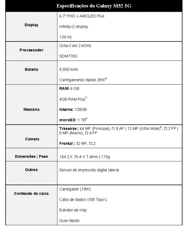 O Galaxy M52 5G chega ao Brasil nesta quinta-feira, 28 de outubro, nas cores Preta e Branca9. Ele é vendido exclusivamente na loja online da Samsung com o preço sugerido de R$3.499. Consulte o valor do produto no site shop.samsung.com/br.