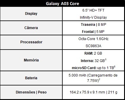 “Com o Galaxy A03 Core, a Samsung foca no trio de features essenciais que o cliente busca em um smartphone: tela grande, performance aprimorada e bateria de longa duração. Este conjunto foca nas funções mais básicas e essenciais que o consumidor precisa, seja usando o smartphone para se divertir ou trabalhar, e sem precisar se preocupar em carregá-lo a todo momento”, explicou Marcelo Daou, gerente sênior de produto da divisão de dispositivos móveis da Samsung Brasil.