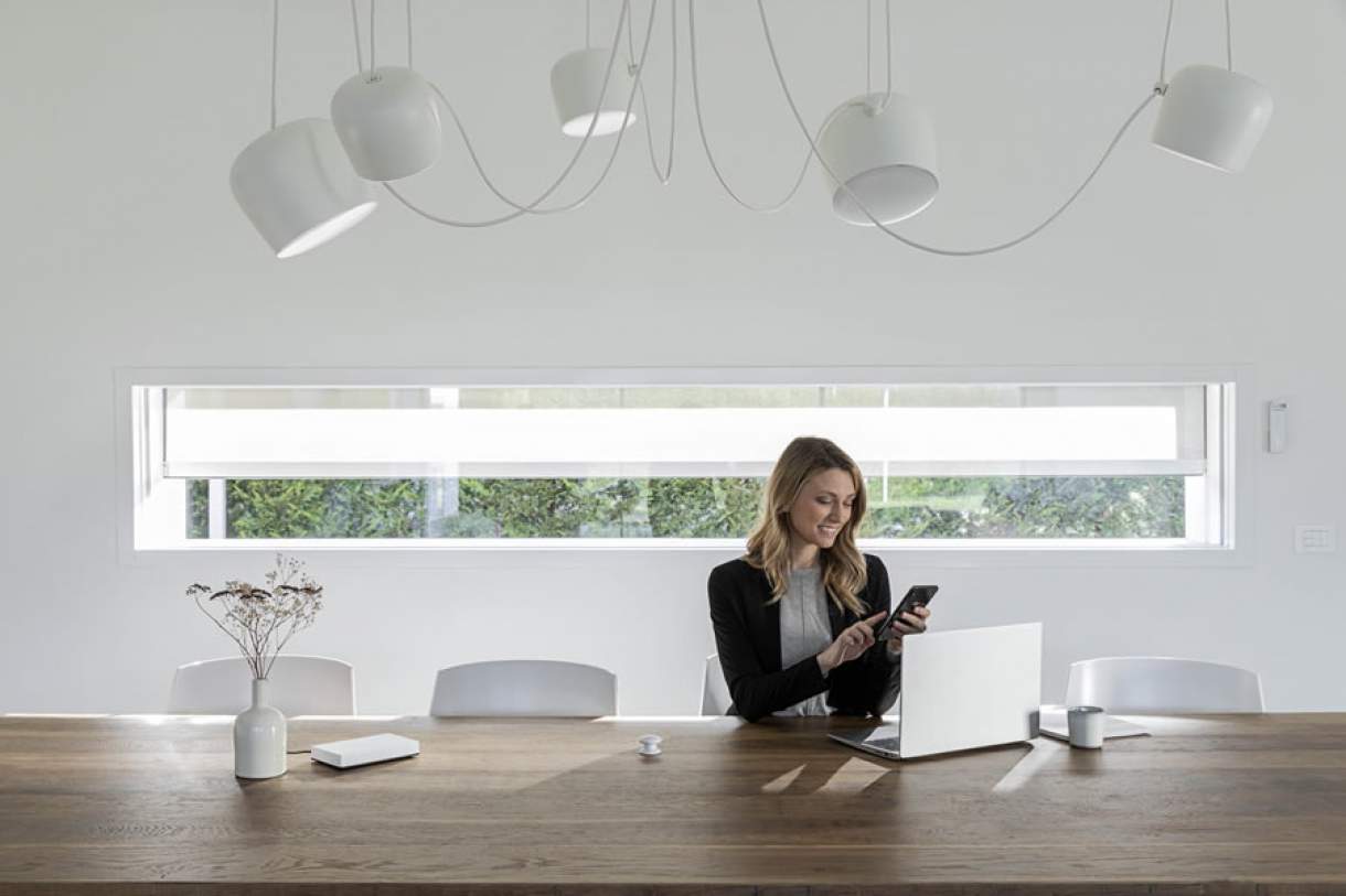 Com a automação, a luz solar torna-se uma aliada para a eficiência energética da sua residência. Controlar cortinas interiores, venezianas, toldos, pérgolas ou persianas permite usar a luz natural para controlar a luminosidade da casa e criar cenários eficientes baseados em diferentes necessidades.