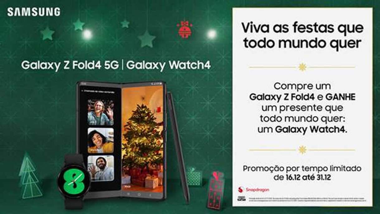Já quem comprar um smartphone dobrável Galaxy Z Fold4 5G2 entre os dias 16 e 31 de dezembro vai ganhar3 um smartwatch Galaxy Watch4. Da mesma forma que o bundle anterior, é preciso resgatar o dispositivo até o dia 31 de dezembro pelo site Samsung Para Você.
