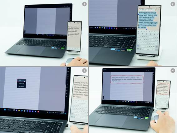 Com o Samsung Multi Controle, as pessoas podem copiar e colar anotações do Galaxy S23 Ultra 5G no Galaxy Book3 Ultra. Também é possível economizar tempo ao transferir fotos ou arquivos simplesmente arrastando e soltando-os de um dispositivo para outro.