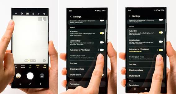 Compartilhe fotos ativando o recurso Auto Share no aplicativo Expert RAW em seu Galaxy S23 Ultra 5G. Uma vez ativado o Auto Share, o arquivo RAW obtido com o smartphone é sincronizado diretamente com a linha Galaxy Book3.