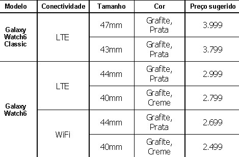 O Galaxy Watch6 e o Galaxy Watch6 Classic começam a ser comercializados no Brasil hoje29, 26 de julho de 2023, e as entregas começam a partir de 11 de agosto.