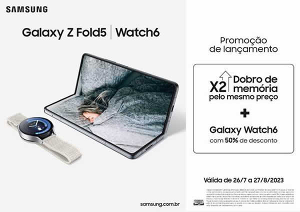 Já quem comprar um Galaxy Z Fold5 de 512 GB receberá10 um upgrade para o modelo Galaxy Z Fold5 de 1TB GB13 e a possibilidade de adquirir um Galaxy Watch6 com 50% de desconto. A ação é válida até o dia 27 de agosto de 2023.