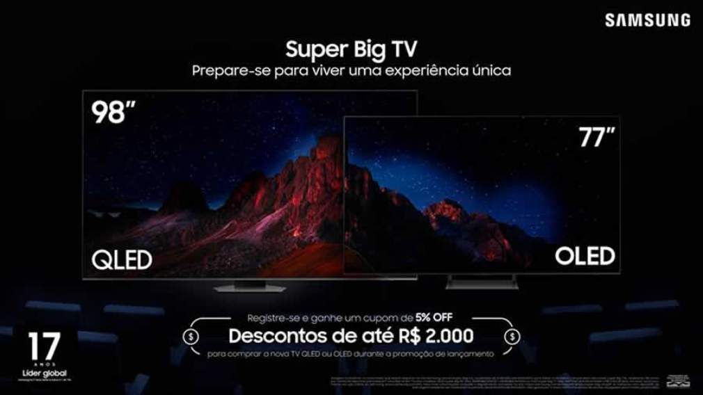 1O consumidor que se pré-registrar no link https://samsung.com.br/big-screens/, no período de 21/08/2023 até 03/09/2023, para saber mais sobre o lançamento das novas Super Big TVs, receberá 5% (cinco por cento) de desconto para adquirir uma das Smart TVs dos modelos: QLED Super Big 98” (SKU: QN98Q80CMGXZD / QN98Q80CAGXZD) ou OLED Super Big 77” (SKU: QN77S90CAGXZD) limitado à R$ 2.000,00 (dois mil reais), exclusivamente na Loja Online da Samsung (www.samsung.com/br), Para mais informações consulte o regulamento completo no link: https://samsung.com.br/regulamentos/super-big-tvs.pdf. As compras com desconto do pré-registro poderão ser realizadas no período de 04/09/2023 até 01/10/2023. Líder global por 17 anos: Conforme dados de vendas divulgados pela Omdia, janeiro/2023.