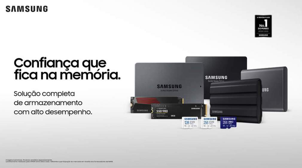 A Samsung lançou hoje (12), pela primeira vez no mercado brasileiro, dispositivos de memória e armazenamento SSD, nas variantes SATA e NVMe para diferentes necessidades de consumidores, como criadores de conteúdo profissionais, gamers e heavy users de tecnologia, bem como fotógrafos e filmakers que buscam garantir espaço de armazenamento em seu PC, notebook ou console, além de elevar a velocidade do seu dispositivo. O portfólio também inclui SSDs portáteis, que funcionam como uma unidade de armazenamento externo com alta velocidade na transferência de dados, além de cartões de memória. Veja abaixo mais detalhes sobre os cada um dos produtos.
