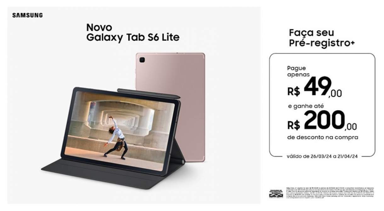 2 Adquirindo um voucher no valor de R$ 49,00 no período de 26/03/24 até 21/04/24 o consumidor terá direito a um desconto adicional de até R$ 200,00 para adquirir um dos modelos do Galaxy Tab S6 Lite que será lançado pela Samsung em 01/04/24. O valor final do desconto adicional dependerá do modelo do produto adquirido. O desconto máximo de R$ 200,00 é válido para compra do modelo Galaxy Tab S6 Lite 64 GB modelos SM-P620 ou SM-P625. Período de compra: a partir das 0:00h do dia 01/04/24 até 28/04/24. O voucher de R$ 49,00 terá validade de um ano a partir da data da compra e poderá ser utilizado sem desconto adicional para compras de outros produtos Samsung. Válida em Link. Consulte o regulamento: Link.