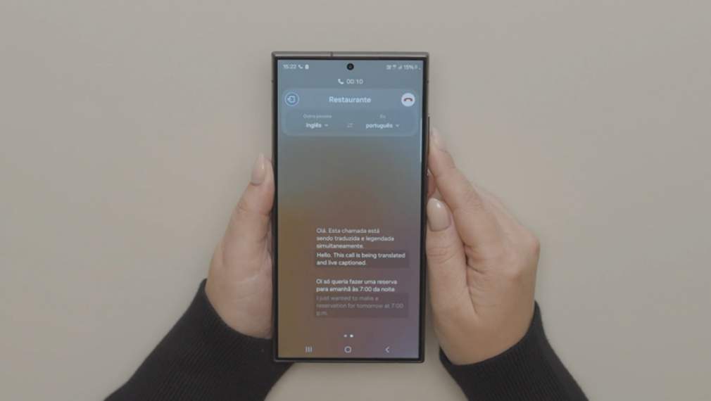 Imagine que você está em uma viagem para os Estados Unidos e deseja conhecer um restaurante. Com a Tradução Simultânea, basta ligar para o restaurante que o Galaxy AI do seu smartphone traduzirá tudo o que você fala para o Inglês para a pessoa do outro lado da linha.