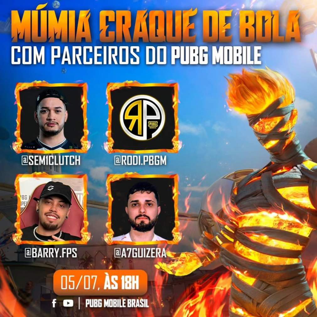 Para celebrar a volta da skin, nesta sexta-feira (5), às 18h, acontecerá a livestream “Múmia Craque de Bola” no canal oficial de PUBG MOBILE no YouTube e Facebook. A transmissão contará com a participação dos influenciadores Paulo “Sem1clutch”, RODI.PBGM, Danilo ”Barry” e Guizera. Em clima de Copa América, eles jogarão uma partida de futebol temática no Mundo das Maravilhas, todos vestidos como múmias. Será um evento imperdível e divertido para toda a comunidade!