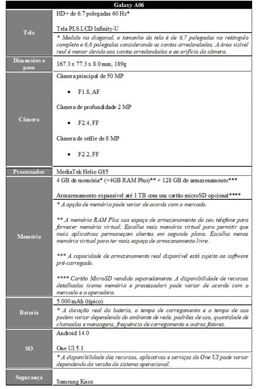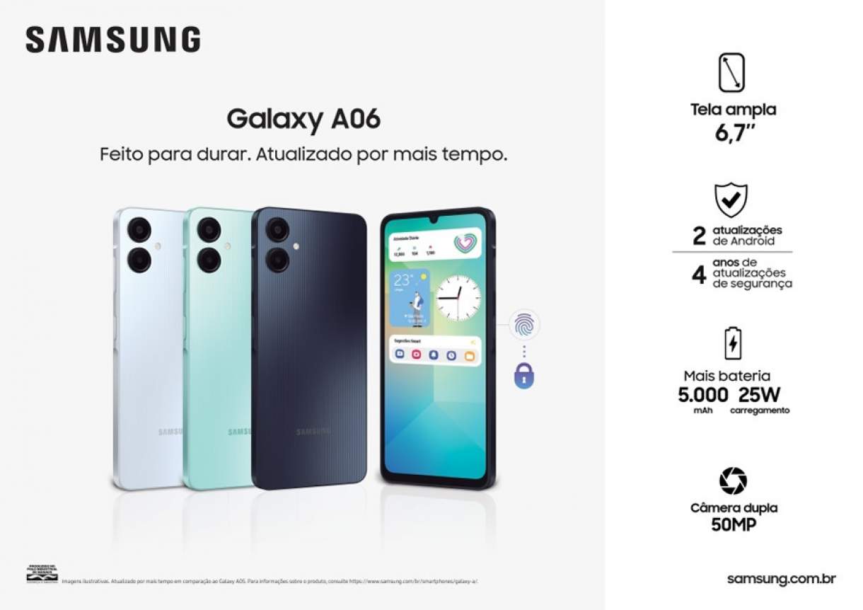 "Poderoso nas mãos e econômico no bolso continua sendo o mote deste modelo, que chega para reforçar o nosso compromisso em oferecer produtos com recursos que fazem a diferença na vida das pessoas. Robusto, seguro, com excelente custo-benefício e DNA de inovação Samsung Galaxy, o A06 oferece tudo que as pessoas precisam e mais procuram em um smartphone”, afirma Rafael Aquino, gerente sênior de produto de Mobile Experience da Samsung Brasil.