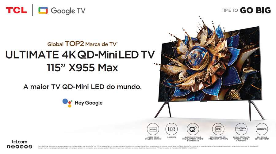 Chega ao mercado brasileiro a TCL Ultimate 4K QD-Mini LED TV X955 Max de 115 polegadas, a maior do mundo com esta tecnologia de painel, reforçando a estratégia de marca da TCL – Time To Go BIG. Focada na expansão do negócio, inovação tecnológica e TVs de telas grandes, a TCL amplia seu portfólio com mais uma inovadora opção para os consumidores brasileiros.