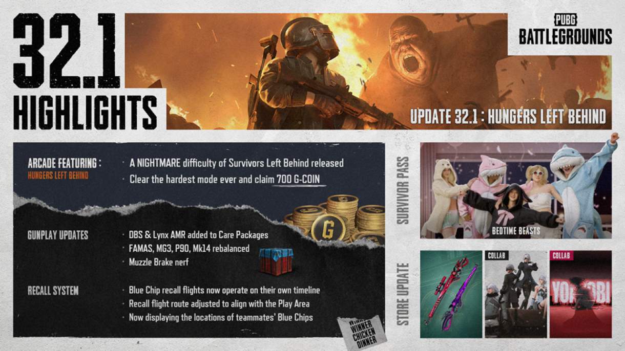 - Mais novidades do 32.1: Além do novo modo e ajustes de armas, a Atualização 32.1 inclui o lançamento de um novo Passe do Sobrevivente, o início da próxima temporada Ranqueada, atualizações no sistema de recall, correções de bugs e muito mais. Para uma visão completa de todas as mudanças, os jogadores podem consultar as Notas do Patch.
