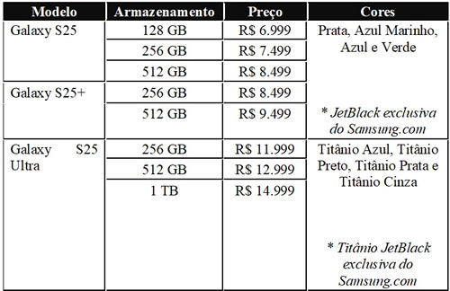 A linha Galaxy S25 estará disponível no Brasil a partir desta quarta-feira, 5 de fevereiro em todo o Brasil. O Galaxy S25 tem preço sugerido a partir de R$ 6.999, o Galaxy S25+ a partir de R$ 8.499 e o Galaxy S25 Ultra a partir de R$ 11.999.