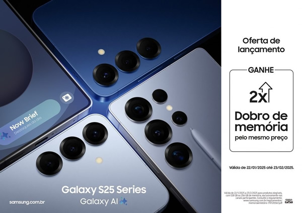 Para o lançamento da linha Galaxy S25, a Samsung oferece memória em dobro7 na aquisição de um novo dispositivo da nova família Galaxy entre 22 de janeiro e 23 de fevereiro de 2025, exclusivamente nos canais participantes.