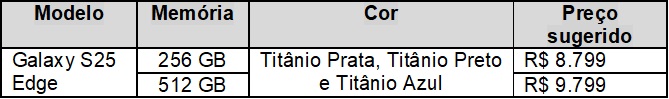 Para mais informações sobre o Galaxy S25 Edge e a série Galaxy S25, visite Samsung Newsroom e Samsung.com/br.