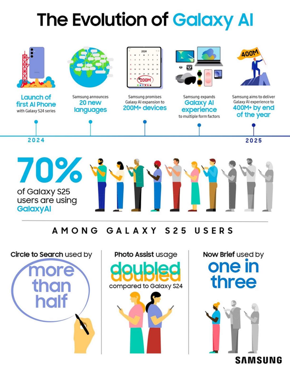 Com o lançamento do Galaxy S24 e o compromisso de democratizar o Galaxy AI* para mais de 200 milhões de dispositivos em 2024, a Samsung Galaxy definiu uma nova era de inovação em AI móvel. Desde então, o Galaxy AI não para de crescer, mudando o que é possível nos smartphones – e levando mais de 70% dos usuários do Galaxy S25 a utilizarem nosso conjunto de ferramentas de AI. Entre esses recursos, o Google Gemini apresentou o maior crescimento, com uso triplicado na linha S mais recente.