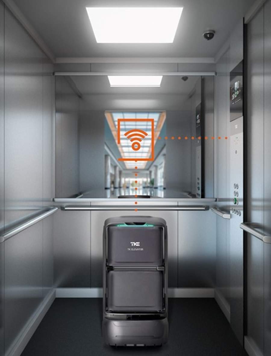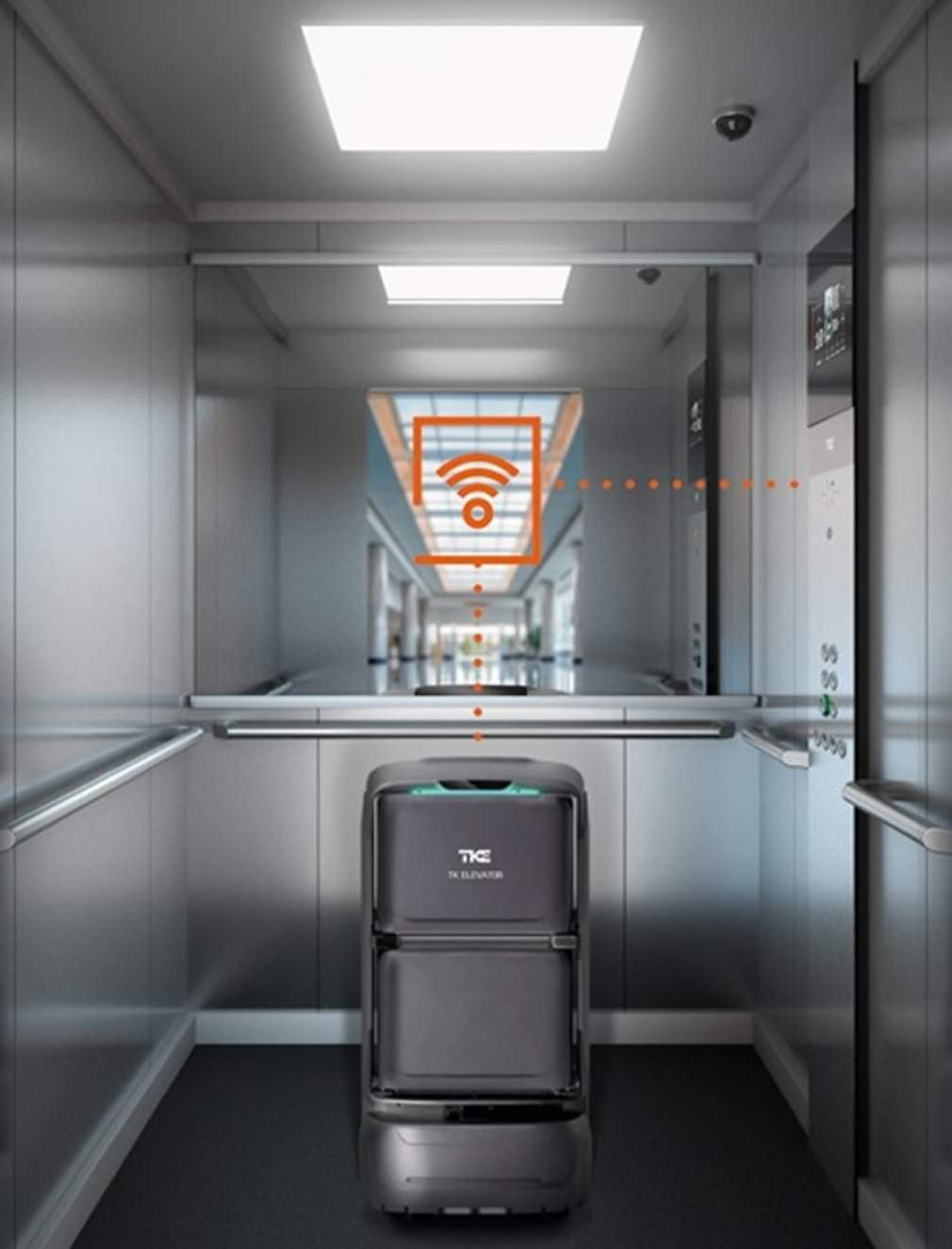 A conexão entre o robô e os elevadores é feita por meio de sinais de comunicação. O elevador TKE já sai de fábrica preparado para esta integração, servindo de apoio para a operação que o robô precisa executar como, por exemplo, para qual andar vai se deslocar.