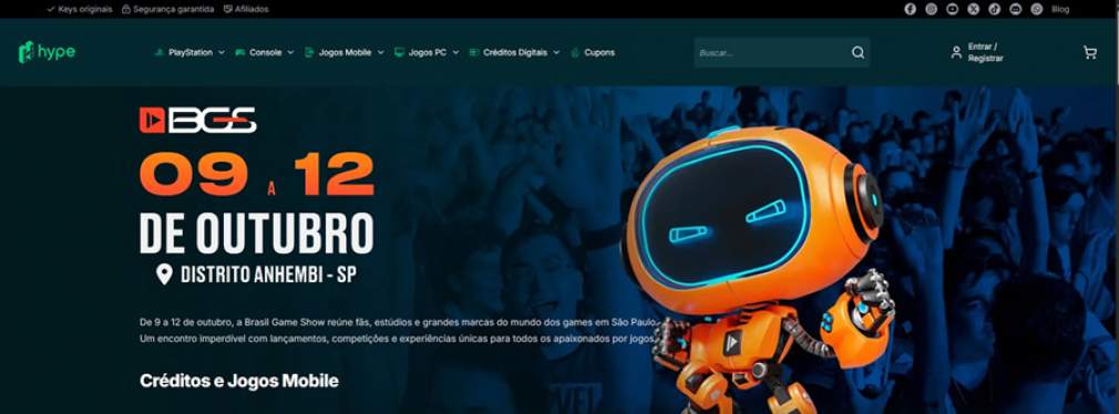 A identidade visual da BGS também estará presente no Hype Games, com banners em diferentes pontos da plataforma redirecionando os usuários para a página do evento.