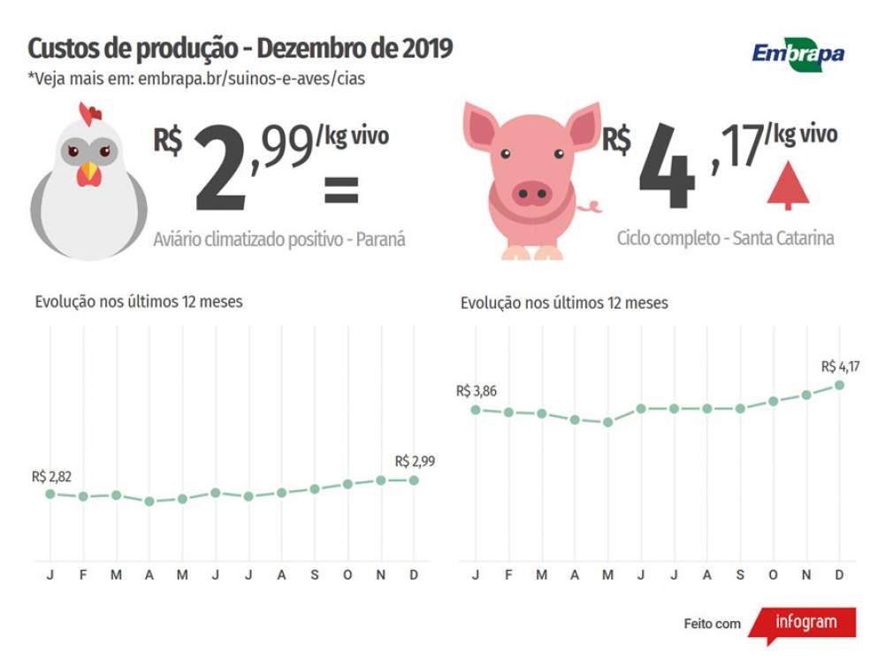 Os índices de custos de produção foram criados em 2011 pela equipe de socioeconomia da Embrapa Suínos e Aves e Conab. Santa Catarina e Paraná são usados como estados referência nos cálculos por serem os maiores produtores nacionais de suínos e de frangos de corte, respectivamente.