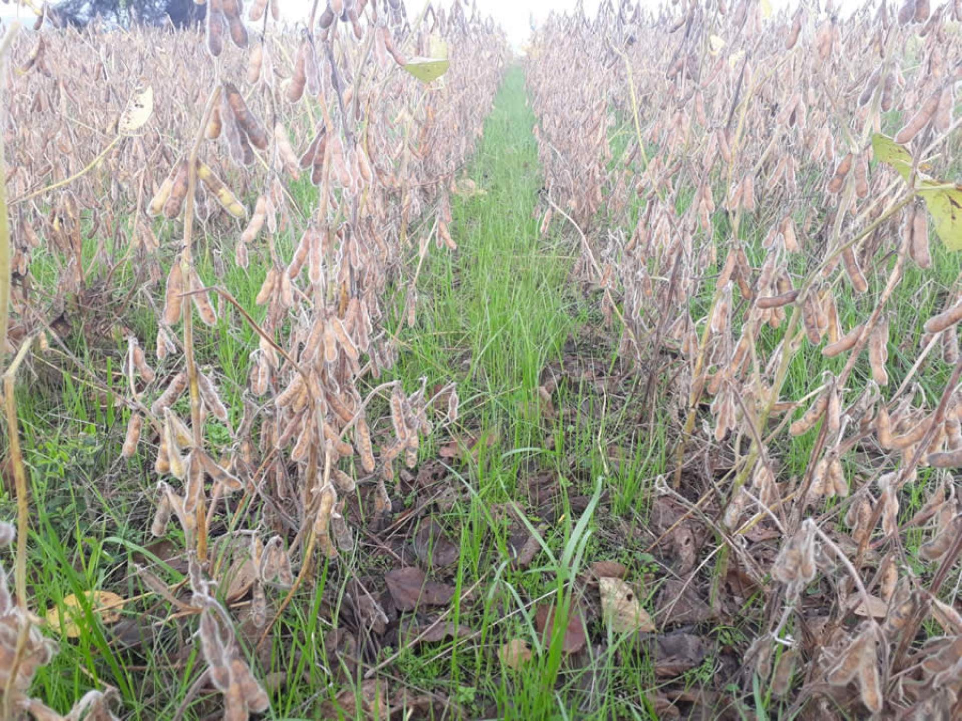 Neste mesmo experimento os resultados na soja são bastante interessantes. Comparando o estande da lavoura nas diferentes alturas de manejo do azevém/aveia só teremos redução da população de plantas de soja quando a pastagem é manejada a 10 cm desde que ocorra um período seco na época da implantação, caso contrário, a própria plantadeira rompe a camada compactada superficial e num ano chuvoso não teremos diferença no estande da lavoura de soja independente da altura de manejo da pastagem de inverno.