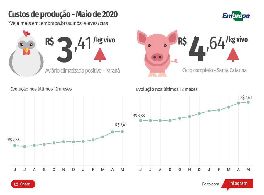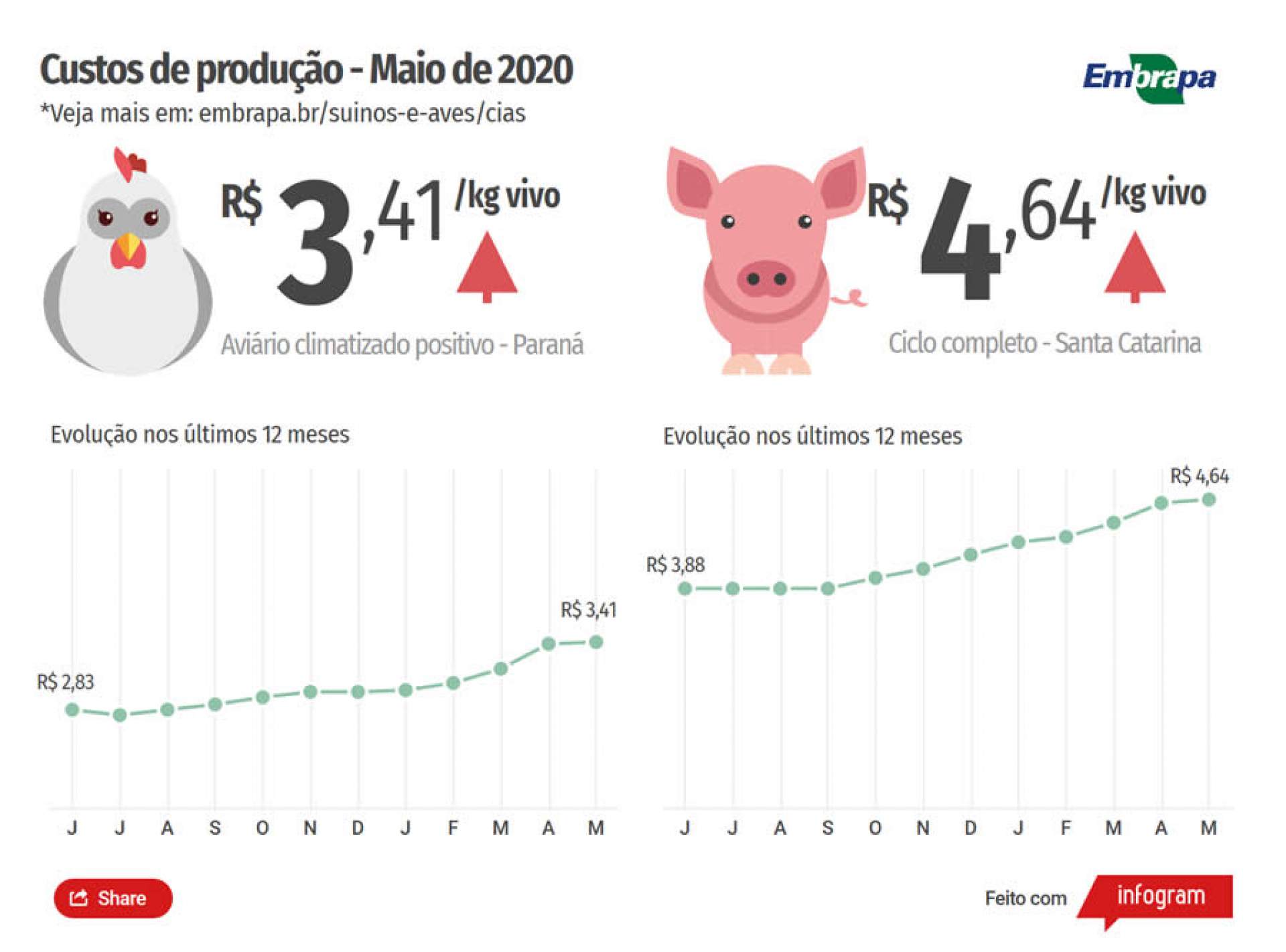 Os custos de produção de suínos e de frangos de corte calculados pela CIAS, a Central de Inteligência de Aves e Suínos da Embrapa, voltaram a ter mais um mês de alta em maio, subindo 1% e 0,28%, respectivamente, na comparação com abril. Os dois índices têm acumulado altas em todos os meses de 2020.