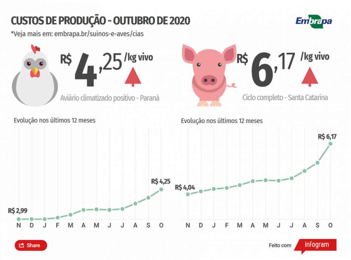 Os custos mensais de produção de suínos e de frangos de corte calculados pela CIAS (embrapa.br/suínos-e-aves/cias), a Central de Inteligência de Aves e Suínos da Embrapa tiveram mais um mês de grande elevação. Em outubro, o ICPSuíno chegou aos 352,95 pontos, +14,98% em relação a setembro, superando o então recorde nominal do índice, de 306,95 pontos, que também era do nono mês de 2020. Já o ICPFrango fechou o outubro nos 328,76 pontos, +8,89% em comparação a setembro. Também é o novo recorde nominal do índice criado em 2011 pela Embrapa e Conab para medir a variação mensal dos custos de produção.